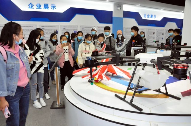 在子園區(qū)產(chǎn)品展廳,同學(xué)們被展臺(tái)上的多旋翼植保無(wú)人機(jī)、取苗機(jī)械手、栽植機(jī)械手等產(chǎn)品吸引了注意力,紛紛拿起手機(jī)對(duì)著展臺(tái)拍起照來(lái)。子園區(qū)河南科技大學(xué)·大學(xué)科技園工作人員介紹了河科大師生創(chuàng)新企業(yè)、團(tuán)隊(duì)的研發(fā)成果及市場(chǎng)應(yīng)用情況,同學(xué)們聽后連連贊嘆。